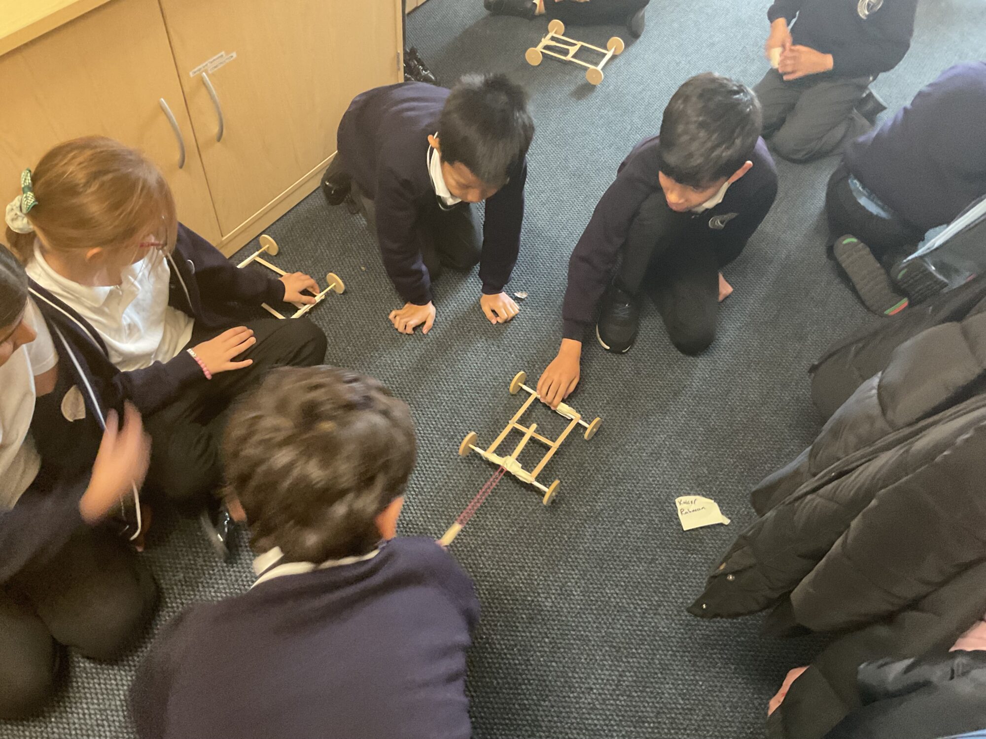 The current unit that Year 4 are working on involves using kinetic energy to power a small vehicle. First, they created a strong chassis using lollipop sticks, a dowel axle and wooden wheels. Would it travel? It certainly would! Time…
