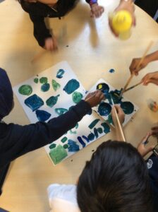 Using our knowledge we then moved on to mixing paint (red + yellow =  orange, blue + yellow = green, blue + red = purple) We noticed that we had made different shades of orange, green and purple.