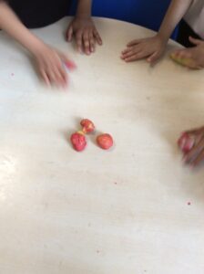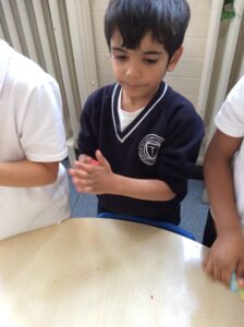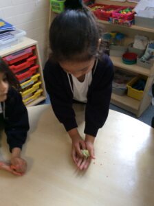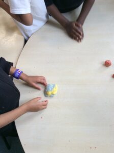 We have been colour mixing  using playdough. We mixed our primary colours red, yellow and blue. We focused on keywords mixing and blending to help us understand the process of change in colour.  We mixed primary colours to make secondary colours.