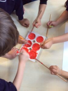 Using our knowledge we then moved on to mixing paint (red + yellow =  orange, blue + yellow = green, blue + red = purple) We noticed that we had made different shades of orange, green and purple.